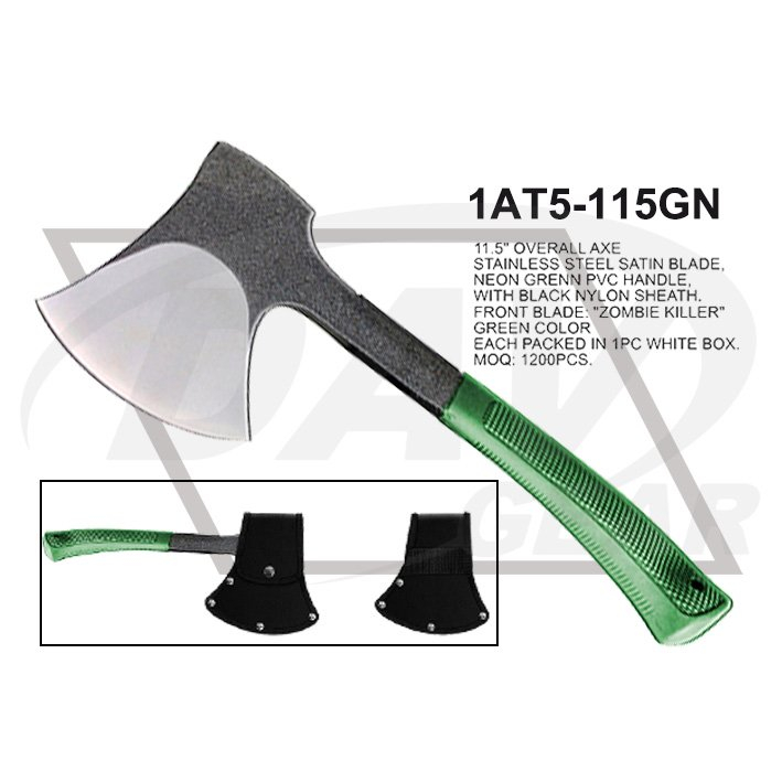 11.5" OVERALL AXE STAINLESS STEEL SATIN BLADE, NEON GREEN PVC HANDLE, WITH BLACK NYLON SHEATH. FRONT BLADE: "ZOMBIE KILLER" green color EACH PACKED IN 1pc WHITE BOX. MOQ: 1200PCS.