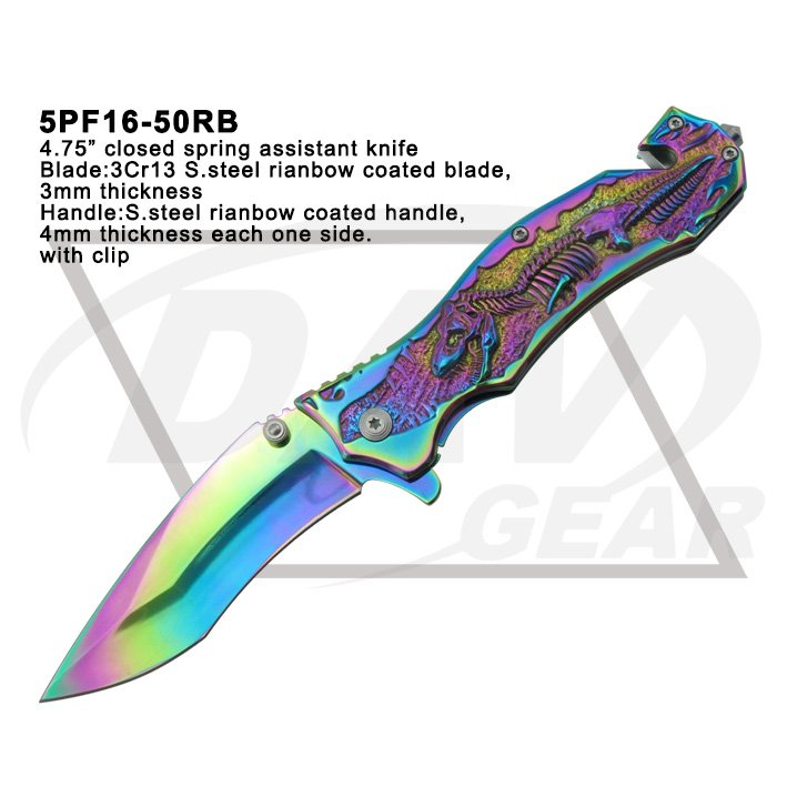 4.75” closed spring assistant knife Blade:3Cr13 S.steel rainbow coated blade, 3mm thickness Handle:S.Steel rainbow coated handle, 4mm thickness each one side. with clip Package:each packed in a two piece color box MOQ:2400PCS