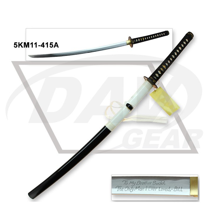 41.34"overall Blade:carbon steel polished blade with laser characters,7.5mm thickness,70cm length Handle:wood handle real fishskin covered wrapped with black real leather cord Guard and fittings:zinc alloy Scabbard:wood scabbard with black&white painting wrapped with nylon cord