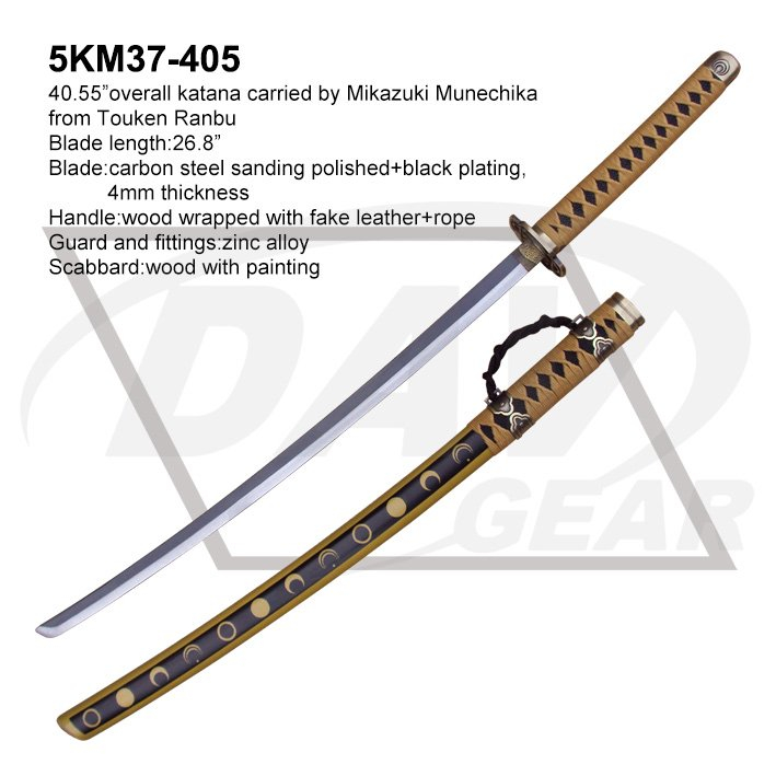 40.55”overall katana carried by Mikazuki Munechika from Touken Ranbu Blade length:26.8” Blade:carbon steel sanding polished+black plating, 4mm thickness Handle:wood wrapped with fake leather+rope Guard and fittings:zinc alloy Scabbard:wood with painting Package:each packed in a factory brown box MOQ:100PCS