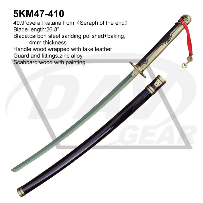 40.9”overall katana from《Seraph of the end》 Blade length:26.8” Blade:carbon steel sanding polished+baking, 4mm thickness Handle:wood wrapped with fake leather Guard and fittings:zinc alloy Scabbard:wood with painting Package:each packed in a factory brown box MOQ:100PCS