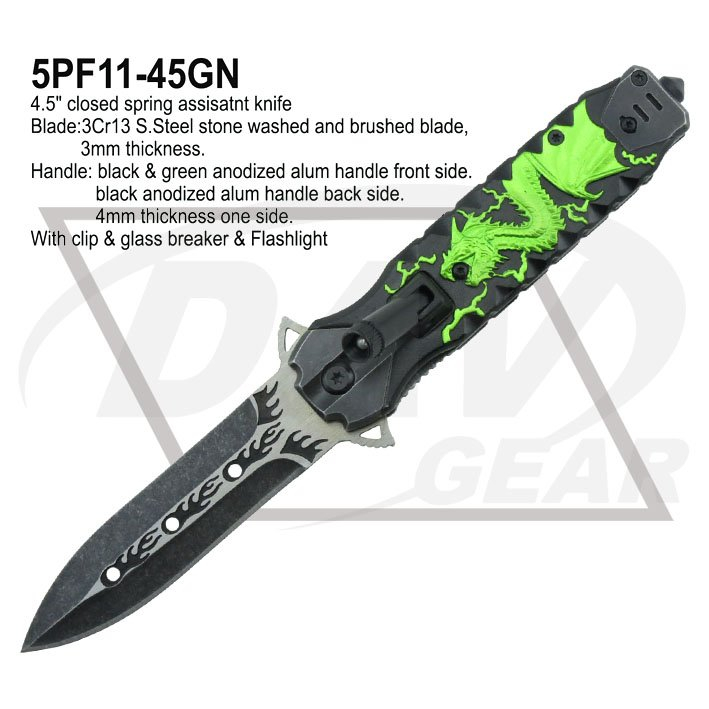 Blade:3Cr13 S.Steel stone washed and brushed blade ,3mm thickness. Handle: black & green anodized alum handle front side,black anodized alum handle back side,4mm thickness one side.