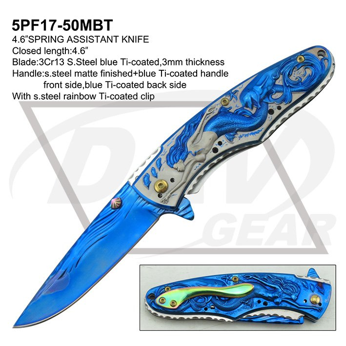 4.6"SPRING ASSISTANT KNIFE Closed length:4.6" Blade:3Cr13 S.Steel blue Ti-coated,3mm thickness Handle:s.steel matte finished+blue Ti-coated handle front side,blue Ti-coated back side With s.steel rainbow Ti-coated clip Package:each packed in a 2-pc color box