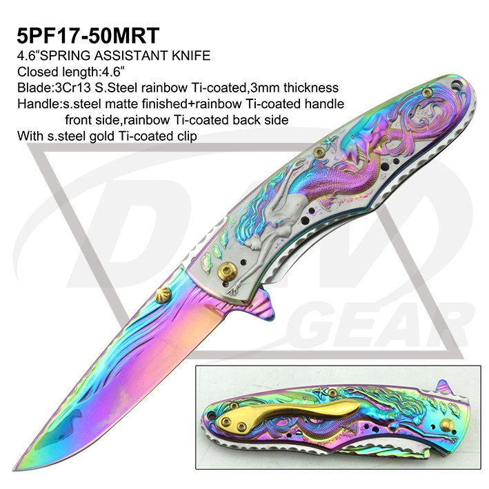 4.6"SPRING ASSISTANT KNIFE Closed length:4.6" Blade:3Cr13 S.Steel rainbow Ti-coated,3mm thickness Handle:s.steel matte finished+rainbow Ti-coated handle front side,rainbow Ti-coated back side With s.steel gold Ti-coated clip Package:each packed in a 2-pc color box