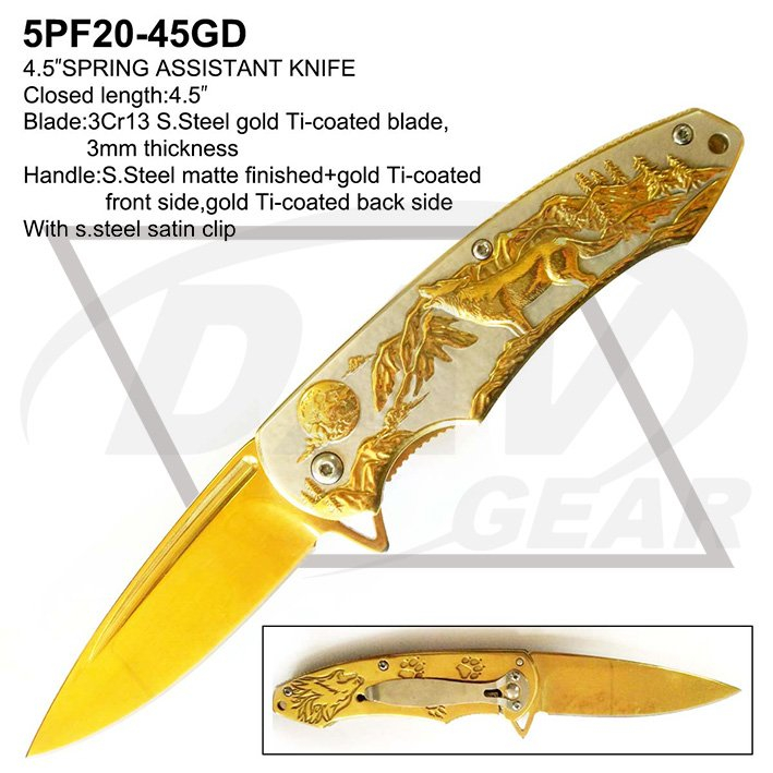 4.5"SPRING ASSISTANT KNIFE Closed length:4.5" Blade:3Cr13 S.Steel gold Ti-coated,3mm thickness Handle:s.steel matte finished+gold Ti-coated handle front side,gold Ti-coated back side With s.steel satin clip Package:each packed in a 2-pc color box