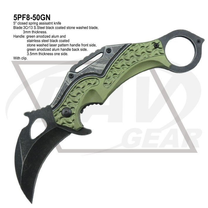 Handle: green anodized alum and stainless steel black coated stone washed laser pattern handle front side,green anodized alum handle back side. 3.5mm thickness one side.