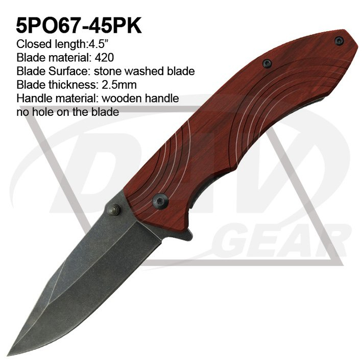 Closed length:4.5” Blade material: 420 Blade Surface: stone washed blade Blade thickness: 2.5mm Handle material: wooden handle no hole on the blade Package:each packed in a white box MOQ:600PCS
