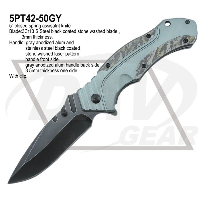 Handle: gray anodized alum and stainless steel black coated stone washed laser pattern handle front side,gray anodized alum handle back side,3.5mm thickness one side.