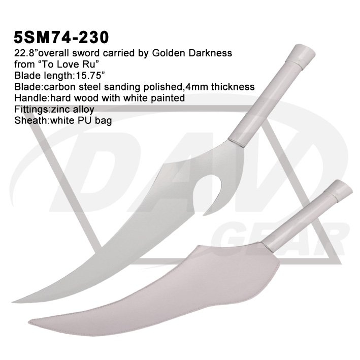22.8”overall sword carried by Golden Darkness from “To Love Ru” Blade length:15.75” Blade:carbon steel sanding polished,4mm thickness Handle:hard wood with white painted Fittings:zinc alloy Sheath:white PU bag Package:each packed in a factory brown box MOQ:100PCS