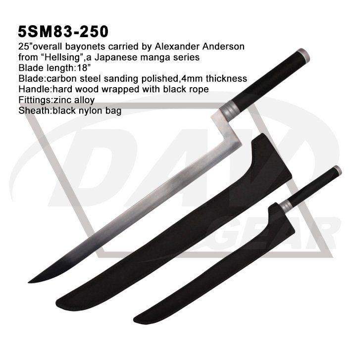 25”overall bayonets carried by Alexander Anderson from “Hellsing”,a Japanese manga series Blade length:18” Blade:carbon steel sanding polished,4mm thickness Handle:hard wood wrapped with black rope Fittings:zinc alloy Sheath:black nylon bag Package:each packed in a factory brown box MOQ:100PCS