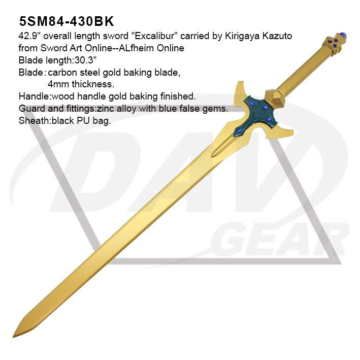 42.9" overall length sword "Excalibur" carried by Kirigaya Kazuto from Sword Art Online--ALfheim Online Blade length:30.3" Blade:carbon steel gold baking blade, 4mm thickness. Handle:wood handle gold baking finished. Guard and fittings:zinc alloy with blue false gems. Sheath:brown PU bag. Package:each packed in a factory brown box. MOQ:50PCS