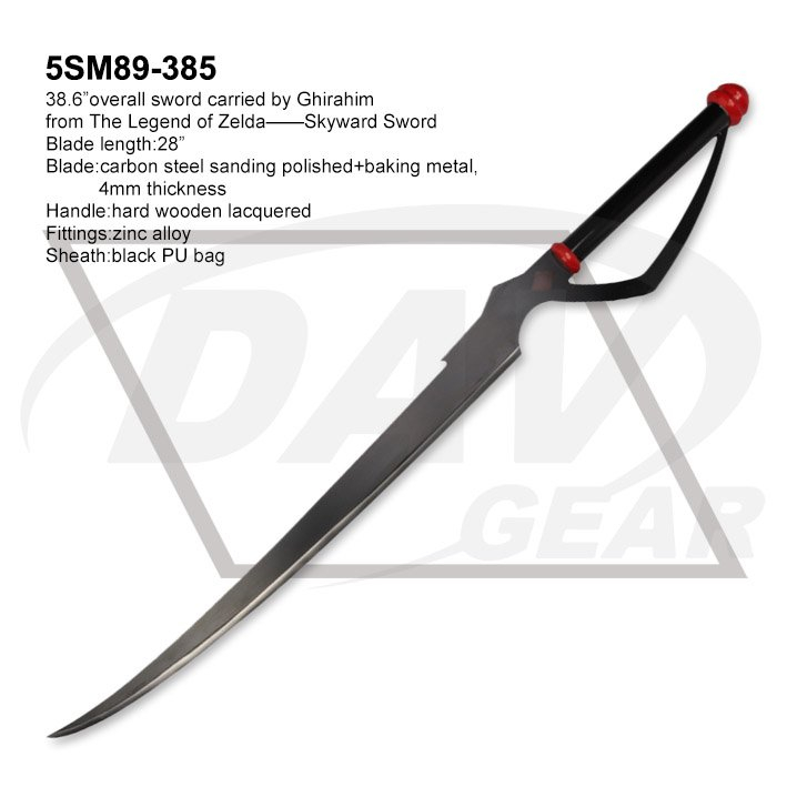38.6”overall sword carried by Ghirahim from The Legend of Zelda——Skyward Sword Blade length:28” Blade:carbon steel sanding polished+baking metal,4mm thickness Handle:hard wooden lacquered Fittings:zinc alloy Sheath:black PU bag Package:each packed in a factory brown box MOQ:100PCS
