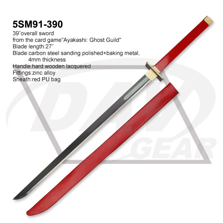 39”overall sword from the card game"Ayakashi: Ghost Guild" Blade length:27” Blade:carbon steel sanding polished+baking metal,4mm thickness Handle:hard wooden lacquered Fittings:zinc alloy Sheath:red PU bag Package:each packed in a factory brown box MOQ:100PCS