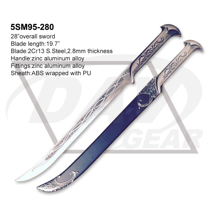 28”overall sword Blade length:19.7” Blade:2Cr13 S.Steel,2.8mm thickness Handle:zinc aluminum alloy Fittings:zinc aluminum alloy Sheath:ABS wrapped with PU Package:each packed in a factory brown box MOQ:300PCS