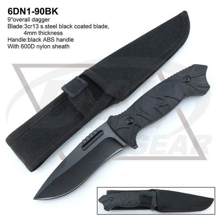 9"overall dagger Blade:3cr13 s.steel black coated blade, 4mm thickness Handle:black ABS handle With 600D nylon sheath Package:each packed in a white box