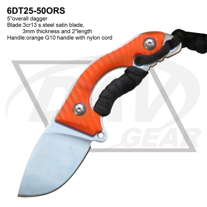 5"overall dagger Blade:3cr13 s.steel satin blade, 3mm thickness and 2"length Handle:orange G10 handle with nylon cord Package:each packed in a 2-pc color box