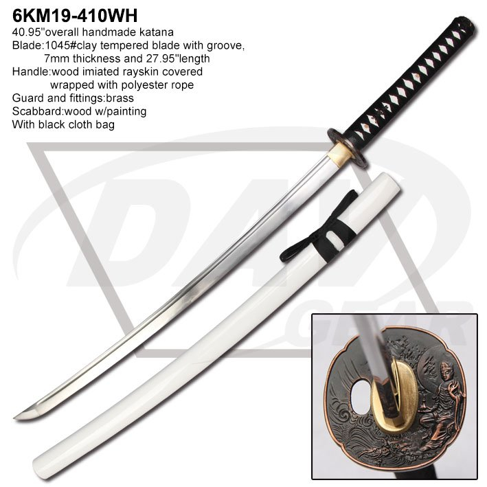 40.95"overall handmade katana Blade:1045#clay tempered blade with groove, 7mm thickness and 27.95"length Handle:wood imiated rayskin covered wrapped with polyester rope Guard and fittings:brass Scabbard:wood w/painting With black cloth bag Package:each packed in a factory brown box MOQ:50PCS