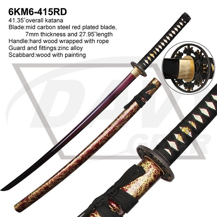 41.35”overall katana Blade:mid carbon steel red plated blade, 7mm thickness and 27.95”length Handle:hard wood wrapped with rope Guard and fittings:zinc alloy Scabbard:wood with painting