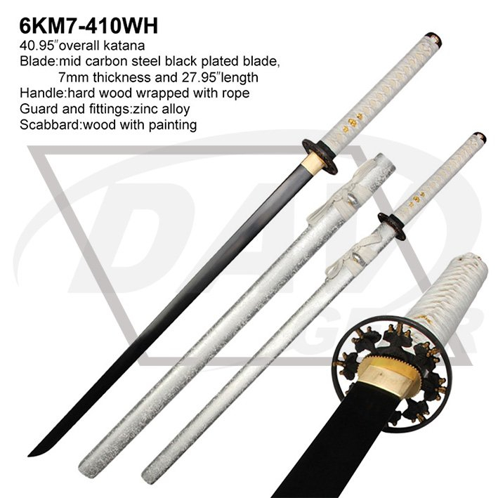 40.95”overall katana Blade:mid carbon steel black plated blade,7mm thickness and 27.95”length Handle:hard wood wrapped with rope Guard and fittings:zinc alloy Scabbard:wood with painting