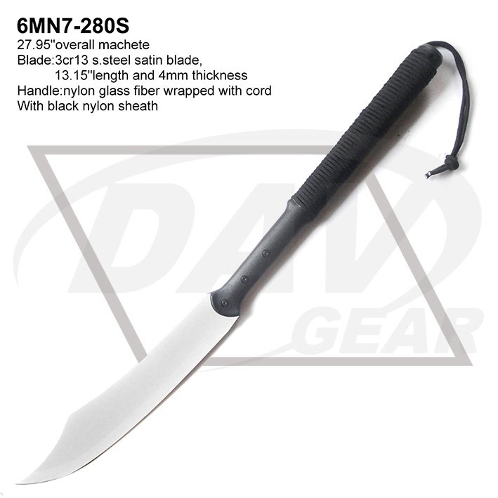 27.95"overall machete Blade:3cr13 s.steel satin blade, 13.15"length and 4mm thickness Handle:nylon glass fiber wrapped with cord With black nylon sheath