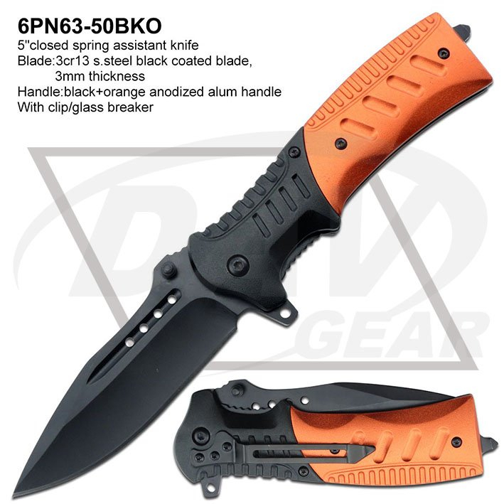 5"closed spring assistant knife Blade:3cr13 s.steel black coated blade, 3mm thickness Handle:black+orange anodized alum handle With clip/glass breaker Package:each packed in a 2-pc color box