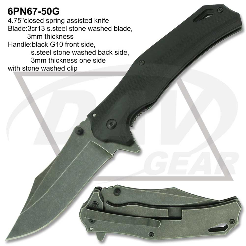 4.75"closed spring assisted knife Blade:3cr13 s.steel stone washed blade, 3mm thickness Handle:black G10 front side, s.steel stone washed back side, 3mm thickness one side with stone washed clip Package:each packed in a 2-pc color box MOQ:1200PCS