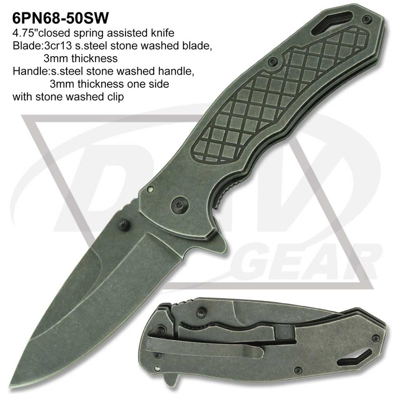 4.75"closed spring assisted knife Blade:3cr13 s.steel stone washed blade, 3mm thickness Handle:s.steel stone washed handle, 3mm thickness one side with stone washed clip Package:each packed in a 2-pc color box MOQ:1200PCS