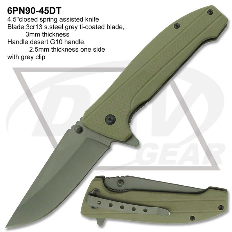 4.5"closed spring assisted knife Blade:3cr13 s.steel grey ti-coated blade, 3mm thickness Handle:desert G10 handle, 2.5mm thickness one side with grey clip Package:each packed in a 2-pc color box MOQ:1200PCS