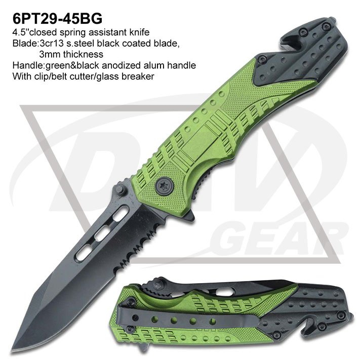 4.5"closed spring assistant knife Blade:3cr13 s.steel black coated blade,3mm thickness Handle:green&black anodized alum handle With clip/belt cutter/glass breaker Package:each packed in a white box