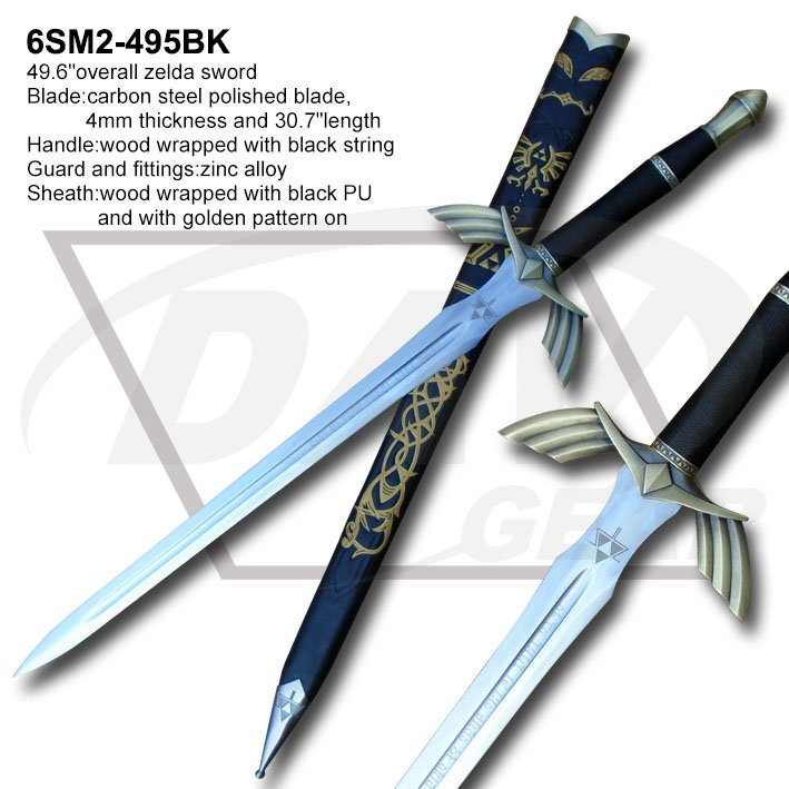 49.6"overall zelda sword Blade:carbon steel polished blade, 4mm thickness and 30.7"length Handle:wood wrapped with black string Guard and fittings:zinc alloy Sheath:wood wrapped with black PU and with golden pattern on