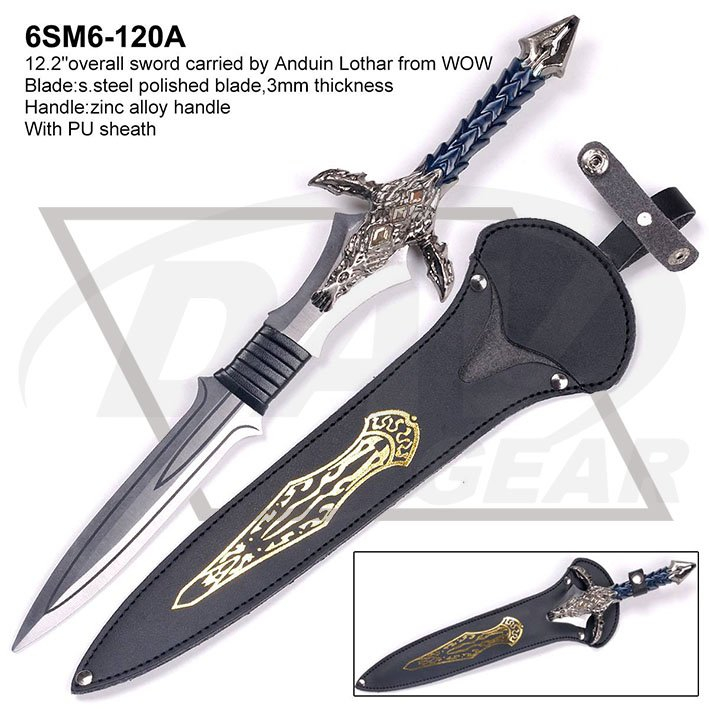 12.2"overall sword carried by Anduin Lothar from WOW Blade:s.steel polished blade,3mm thickness Handle:zinc alloy handle With PU sheath Package:each packed in a factory brown box