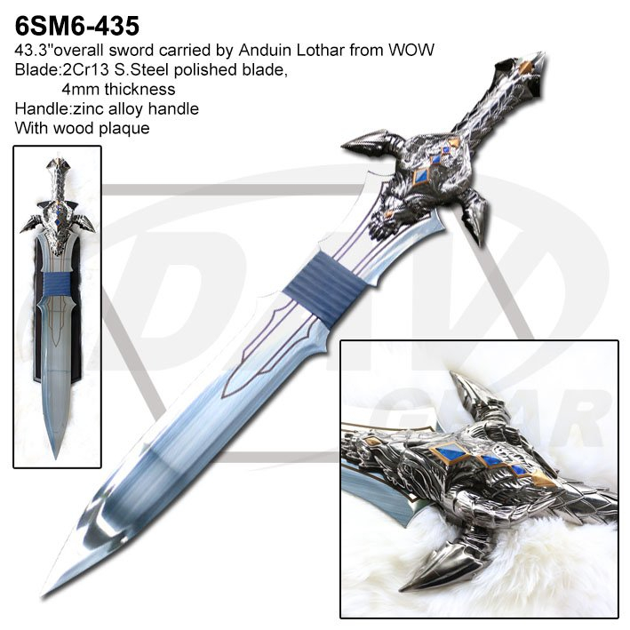 43.3"overall sword carried by Anduin Lothar from WOW Blade:2Cr13 S.Steel polished blade,4mm thickness Handle:zinc alloy handle With wood plaque Package:each packed in a factory brown box