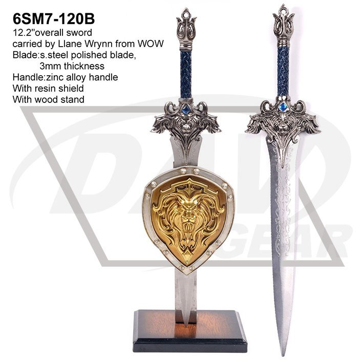 12.2"overall sword carried by Llane Wrynn from WOW Blade:s.steel polished blade, 3mm thickness Handle:zinc alloy handle With resin shield With wood stand Package:each packed in a factory brown box