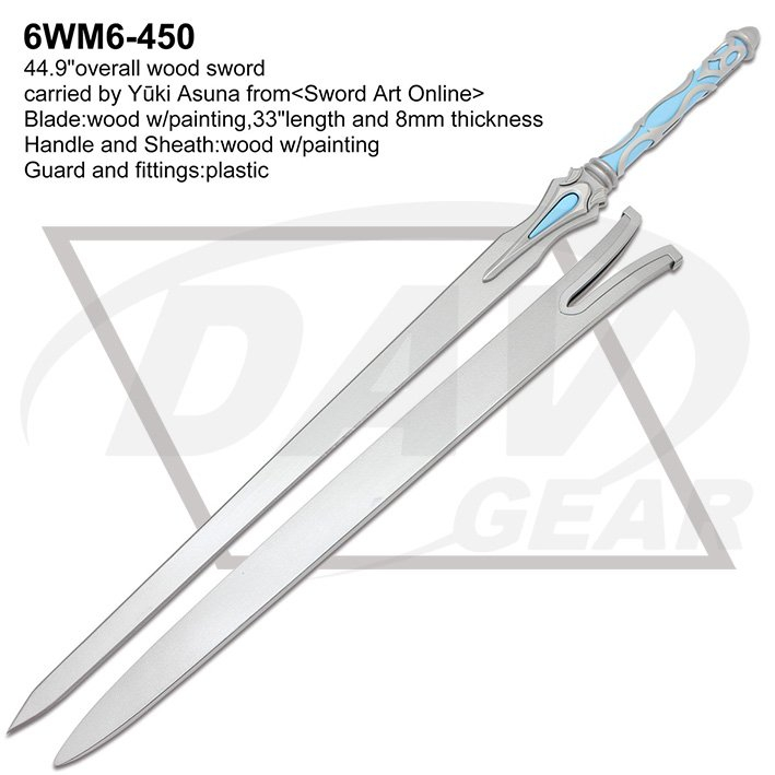 44.9"overall wood sword carried by Yūki Asuna from<Sword Art Online> Blade:wood w/painting,33"length and 8mm thickness Handle and Sheath:wood w/painting Guard and fittings:plastic Package:each packed in a factory brown box