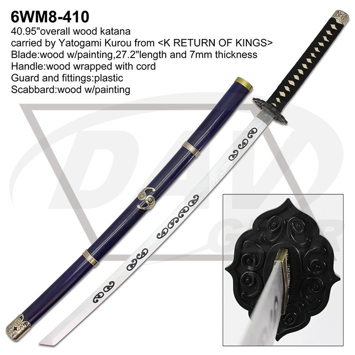40.95"overall wood katana carried by Yatogami Kurou from <K RETURN OF KINGS> Blade:wood w/painting,27.2"length and 7mm thickness Handle:wood wrapped with cord Guard and fittings:plastic Scabbard:wood w/painting Package:each packed in a factory brown box