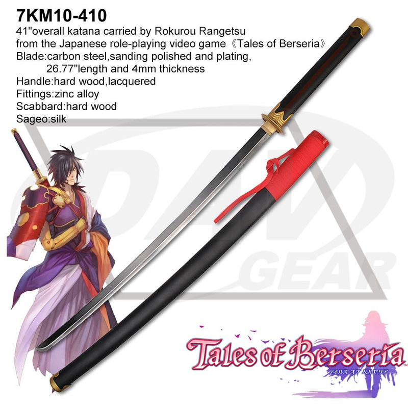 41"overall katana carried by Rokurou Rangetsu come from the Japanese role-playing video game 《Tales of Berseria》 Blade:carbon steel,sanding polished and plating,26.77"length and 4mm thickness Handle:hard wood,lacquered Fittings:zinc alloy Scabbard:hard wood Sageo:silk Package:each packed in a factory brown box MOQ:100PCS