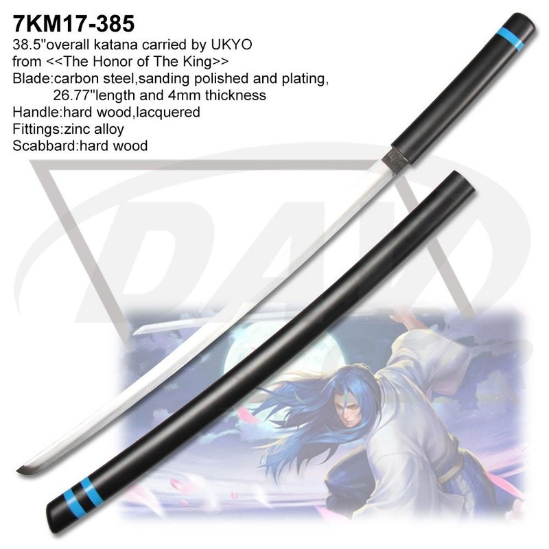 38.5"overall katana carried by UKYO from <<The Honor of The King>> Blade:carbon steel,sanding polished and plating, 26.77"length and 4mm thickness Handle:hard wood,lacquered Fittings:zinc alloy Scabbard:hard wood Package:each packed in a factory brown box MOQ:100PCS