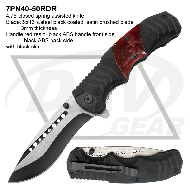 4.75"closed spring assisted knife Blade:3cr13 s.steel black coated+satin brushed blade, 3mm thickness Handle:red resin+black ABS handle front side, black ABS back side with black clip Package:each packed in a 2-pc color box MOQ:1200PCS