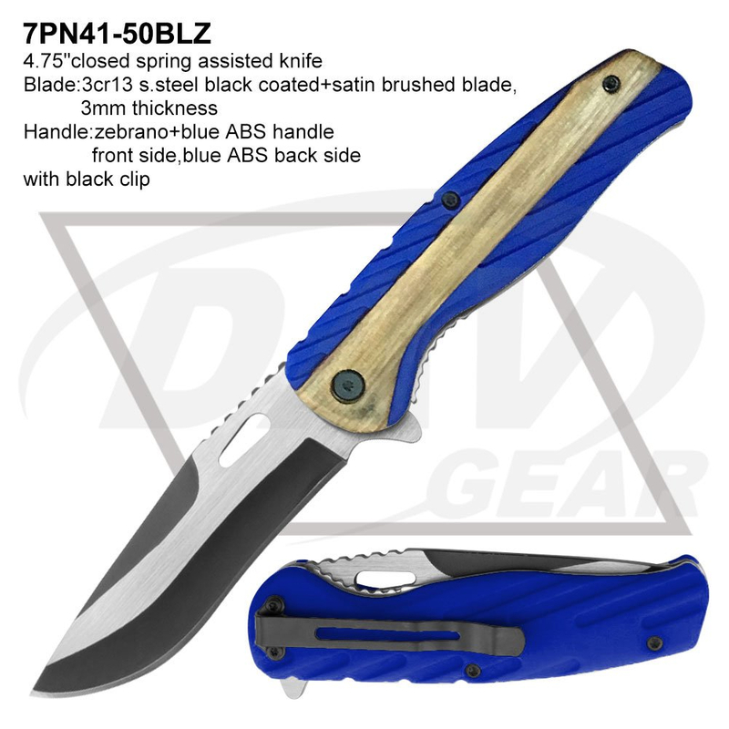 4.75"closed spring assisted knife Blade:3cr13 s.steel black coated+satin brushed blade, 3mm thickness Handle:zebrano+blue ABS handle front side,blue ABS back side with black clip Package:each packed in a 2-pc color box MOQ:1200PCS