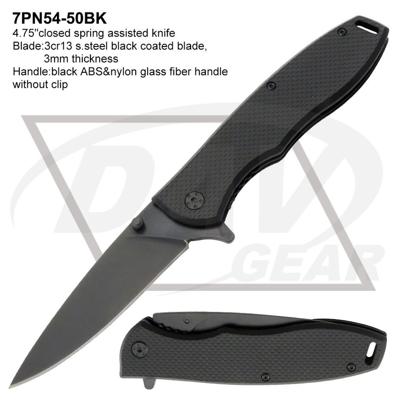4.75"closed spring assisted knife Blade:3cr13 s.steel black coated blade, 3mm thickness Handle:black ABS&nylon glass fiber handle without clip Package:each packed in a color box MOQ:2400PCS