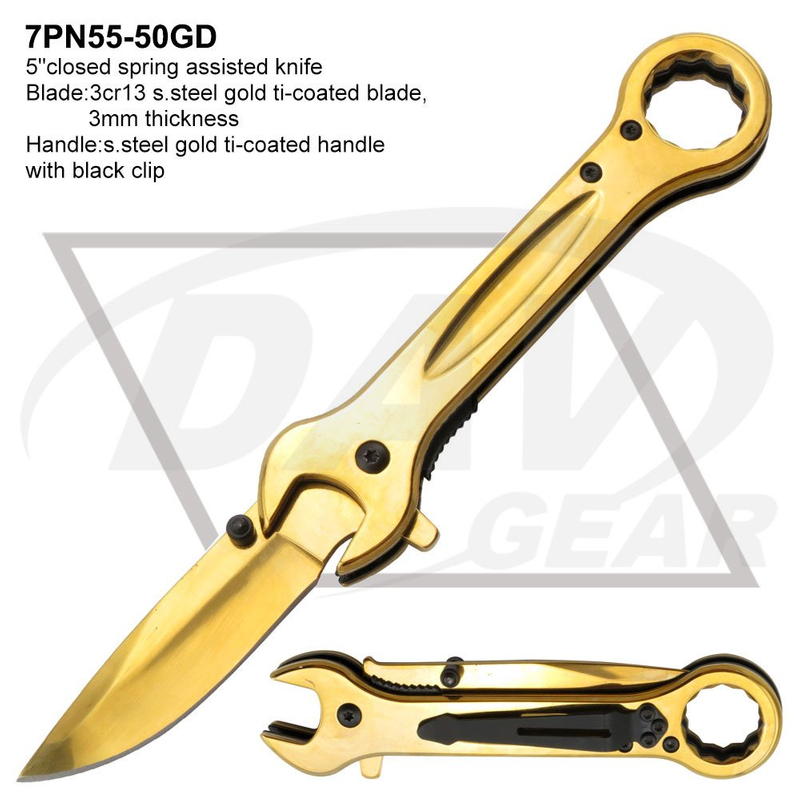 5"closed spring assisted knife Blade:3cr13 s.steel gold ti-coated blade, 3mm thickness Handle:s.steel gold ti-coated handle with black clip Package:each packed in a color box MOQ:1200PCS