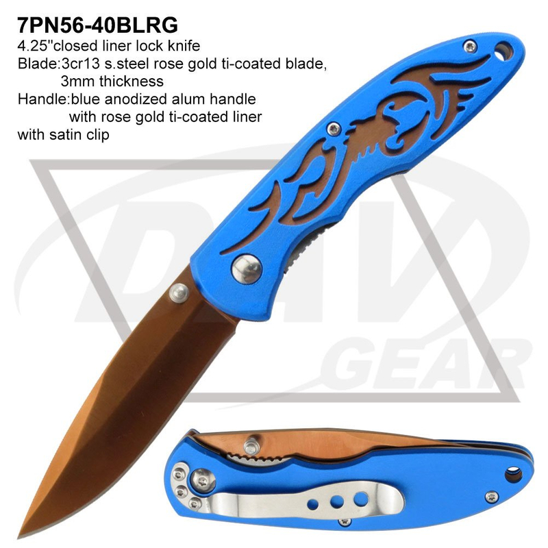 4.25"closed liner lock knife Blade:3cr13 s.steel rose gold ti-coated blade, 3mm thickness Handle:blue anodized alum handle with rose gold ti-coated liner with satin clip Package:each packed in a color box MOQ:1200PCS