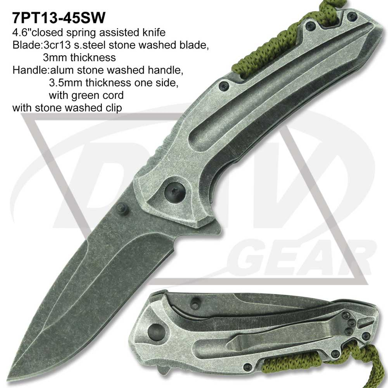 4.6"closed spring assisted knife Blade:3cr13 s.steel stone washed blade, 3mm thickness Handle:alum stone washed handle, 3.5mm thickness one side, with green cord with stone washed clip Package:each packed in a 2-pc color box MOQ:1200PCS