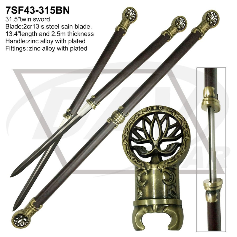 31.5"twin sword Blade:2cr13 s.steel sain blade,13.4"length and 2.5m thickness Handle:zinc alloy with plated Fittings:zinc alloy with plated Package:each packed in a white box MOQ:500PCS