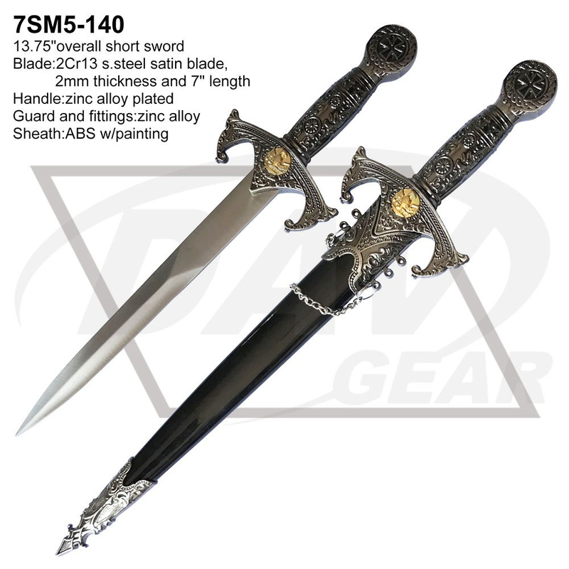 13.75"overall short sword Blade:2Cr13 s.steel satin blade, 2mm thickness and 7" length Handle:zinc alloy plated Guard and fittings:zinc alloy Sheath:ABS w/painting Package:each packed in a 2-pc black box MOQ:600PCS