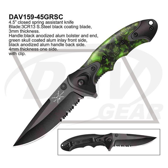 Handle:black anodized alum bolster and end, green skull coated alum inlay front side, black anodized alum handle back side.
