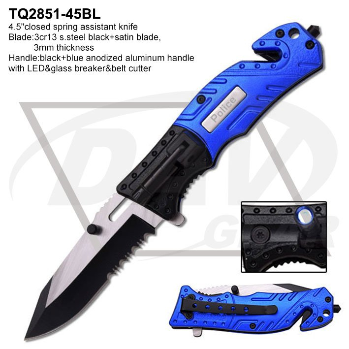 4.5"SPRING ASSISTANT KNIFE Closed length: 4.5" Blade: 3Cr13 stainless steel satin blade, 3mm thickness. Handle: black& blue alum handle, with LED, with glass breaker and belt cutter. Each packed in a 1-PC whit box.